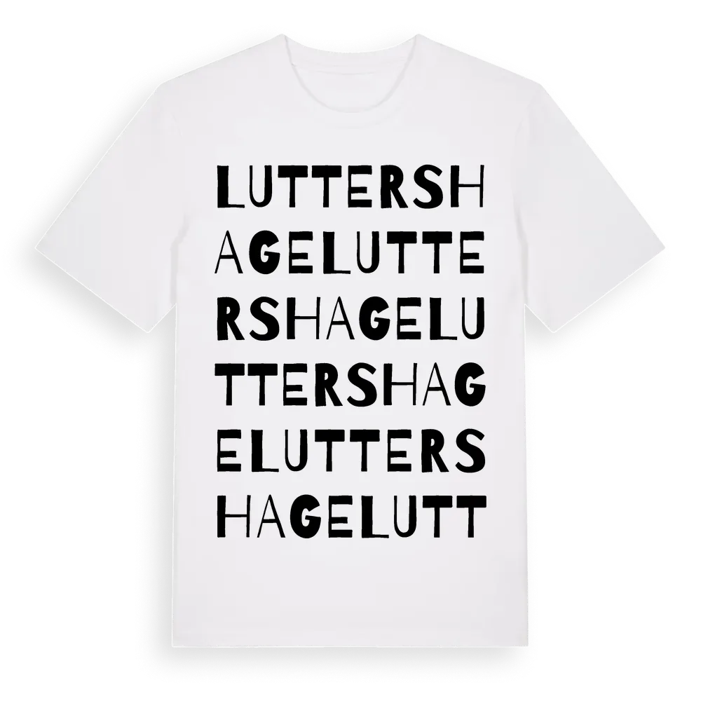 Luttershage ordlek t-shirt är inspirerad av Luttershage i Hallands län, Sverige. Tröjan är designad för dig som har en speciell koppling till platsen – oavsett om du bor här, har rötterna här eller bara älskar Luttershage.