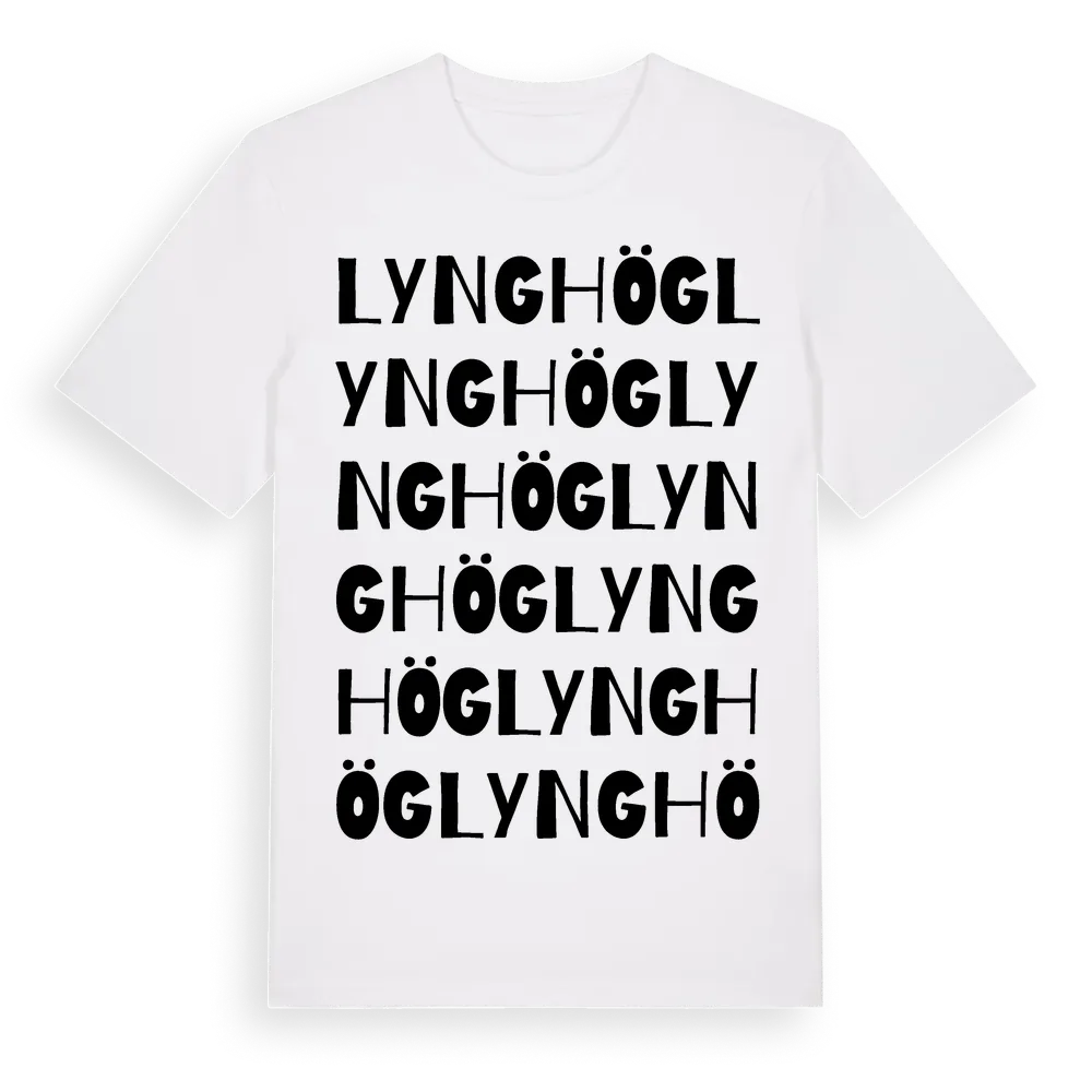 Lynghög ordlek t-shirt är inspirerad av Lynghög i Hallands län, Sverige. Tröjan är designad för dig som har en speciell koppling till platsen – oavsett om du bor här, har rötterna här eller bara älskar Lynghög.