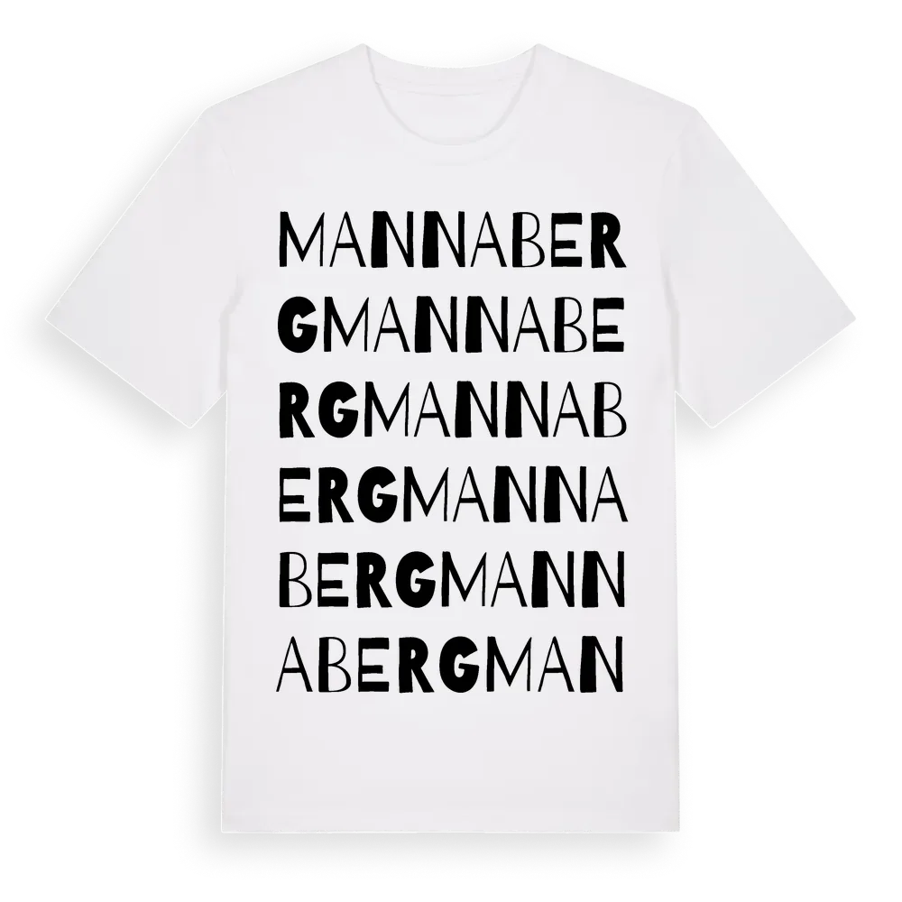 Mannaberg ordlek t-shirt är inspirerad av stadsdelen Mannaberg i Hallands län, Sverige. Tröjan är designad för dig som har en speciell koppling till platsen – oavsett om du bor här, har rötterna här eller bara älskar Mannaberg.