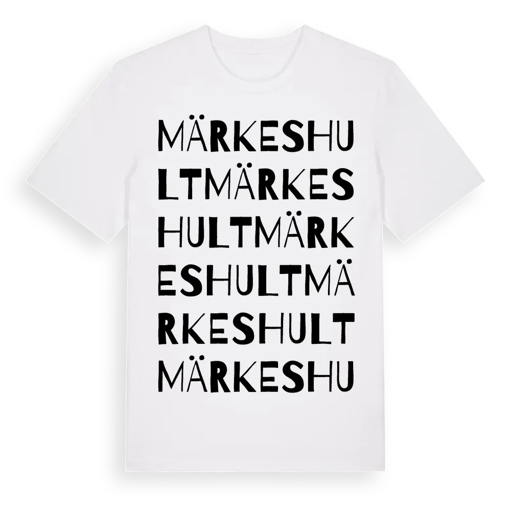 Märkeshult ordlek t-shirt är inspirerad av Märkeshult i Hallands län, Sverige. Tröjan är designad för dig som har en speciell koppling till platsen – oavsett om du bor här, har rötterna här eller bara älskar Märkeshult.