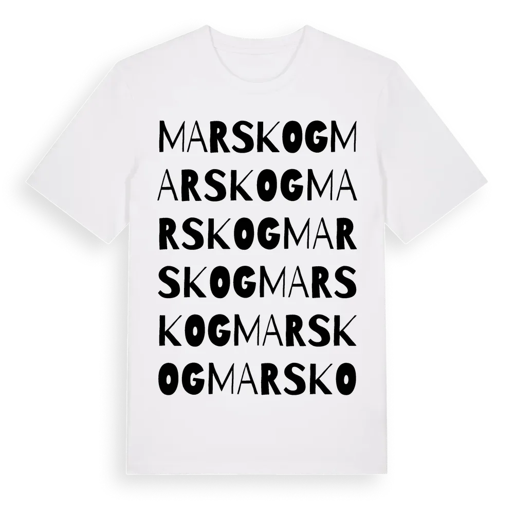 Marskog ordlek t-shirt är inspirerad av Marskog i Hallands län, Sverige. Tröjan är designad för dig som har en speciell koppling till platsen – oavsett om du bor här, har rötterna här eller bara älskar Marskog.
