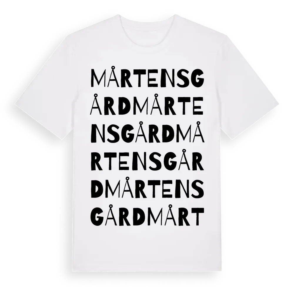 Mårtensgård ordlek t-shirt är inspirerad av Mårtensgård i Hallands län, Sverige. Tröjan är designad för dig som har en speciell koppling till platsen – oavsett om du bor här, har rötterna här eller bara älskar Mårtensgård.