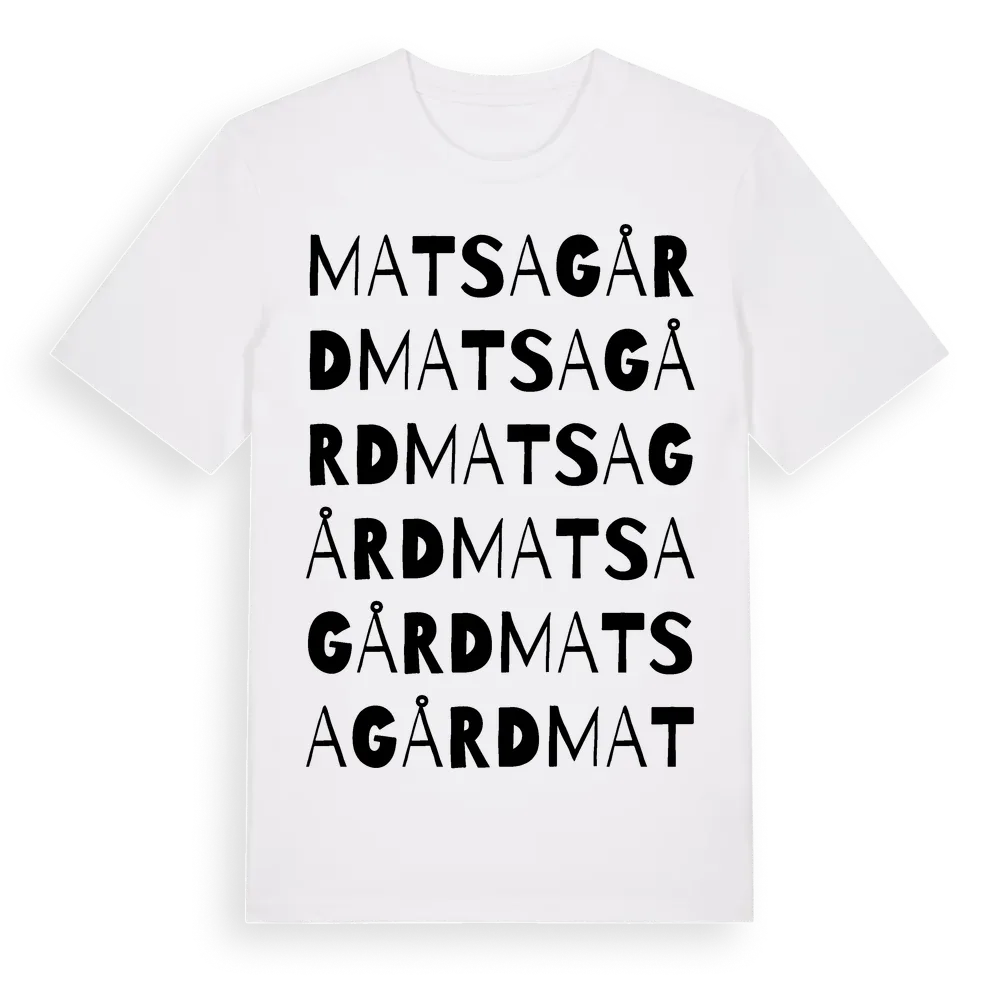 Matsagård ordlek t-shirt är inspirerad av Matsagård i Hallands län, Sverige. Tröjan är designad för dig som har en speciell koppling till platsen – oavsett om du bor här, har rötterna här eller bara älskar Matsagård.