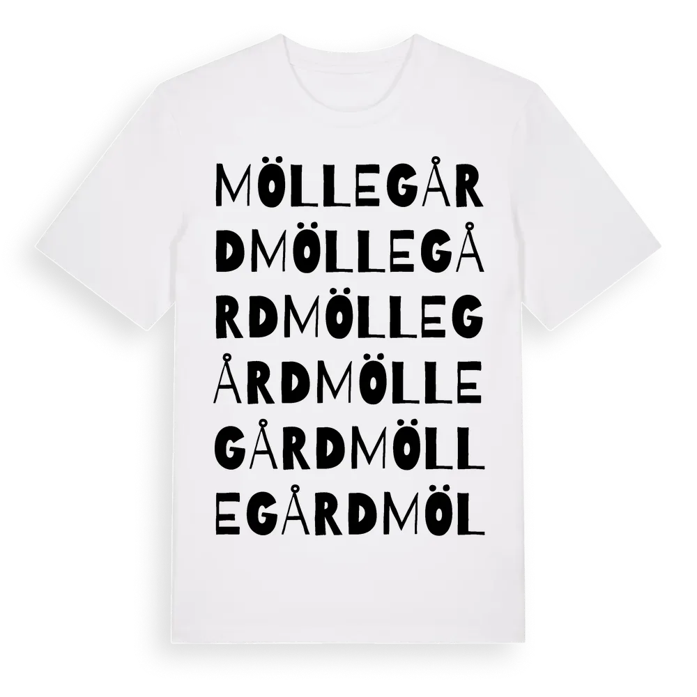Möllegård ordlek t-shirt är inspirerad av Möllegård i Hallands län, Sverige. Tröjan är designad för dig som har en speciell koppling till platsen – oavsett om du bor här, har rötterna här eller bara älskar Möllegård.