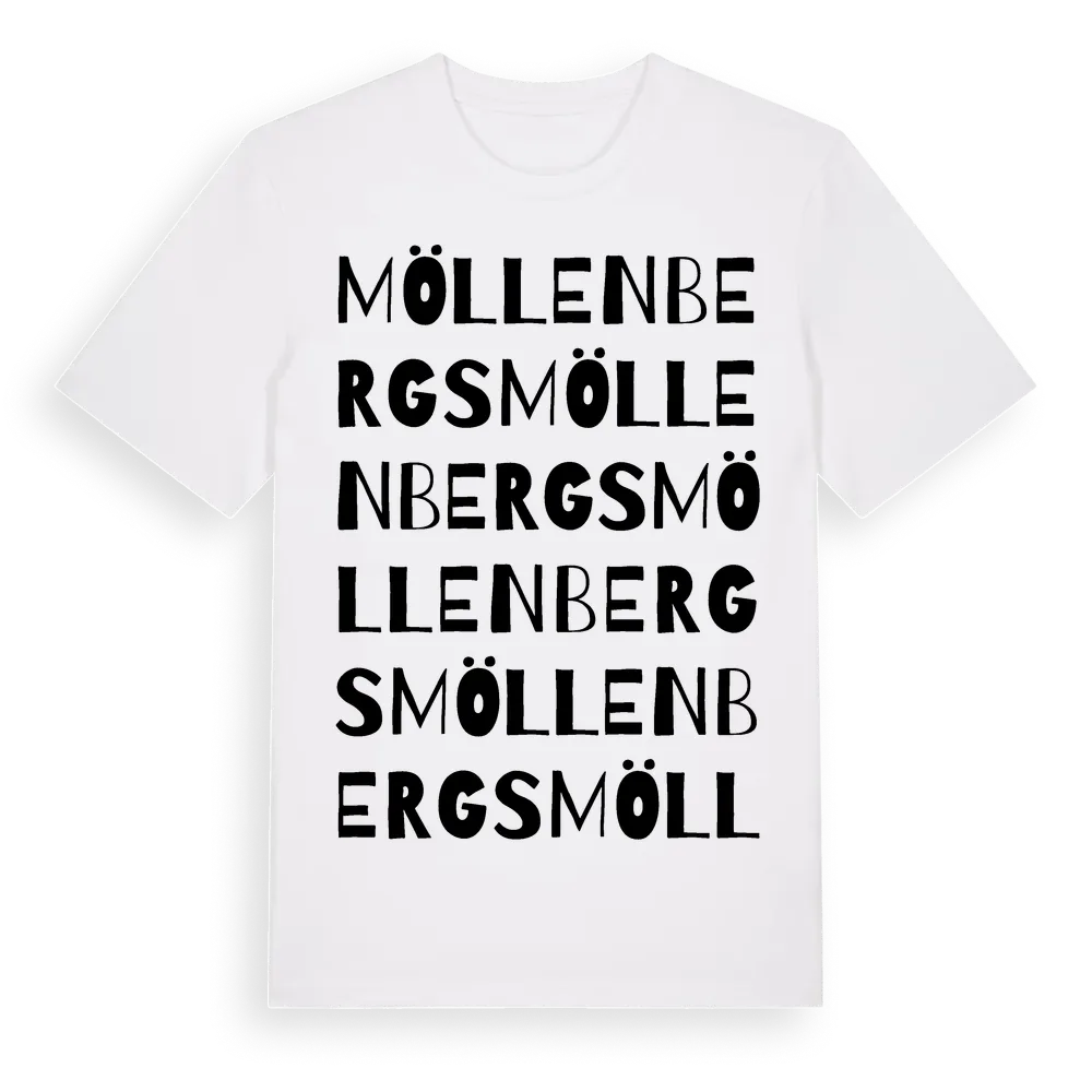 Möllenbergs ordlek t-shirt är inspirerad av Möllenbergs i Hallands län, Sverige. Tröjan är designad för dig som har en speciell koppling till platsen – oavsett om du bor här, har rötterna här eller bara älskar Möllenbergs.