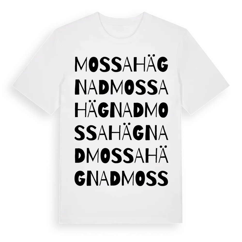 Mossahägnad ordlek t-shirt är inspirerad av Mossahägnad i Hallands län, Sverige. Tröjan är designad för dig som har en speciell koppling till platsen – oavsett om du bor här, har rötterna här eller bara älskar Mossahägnad.