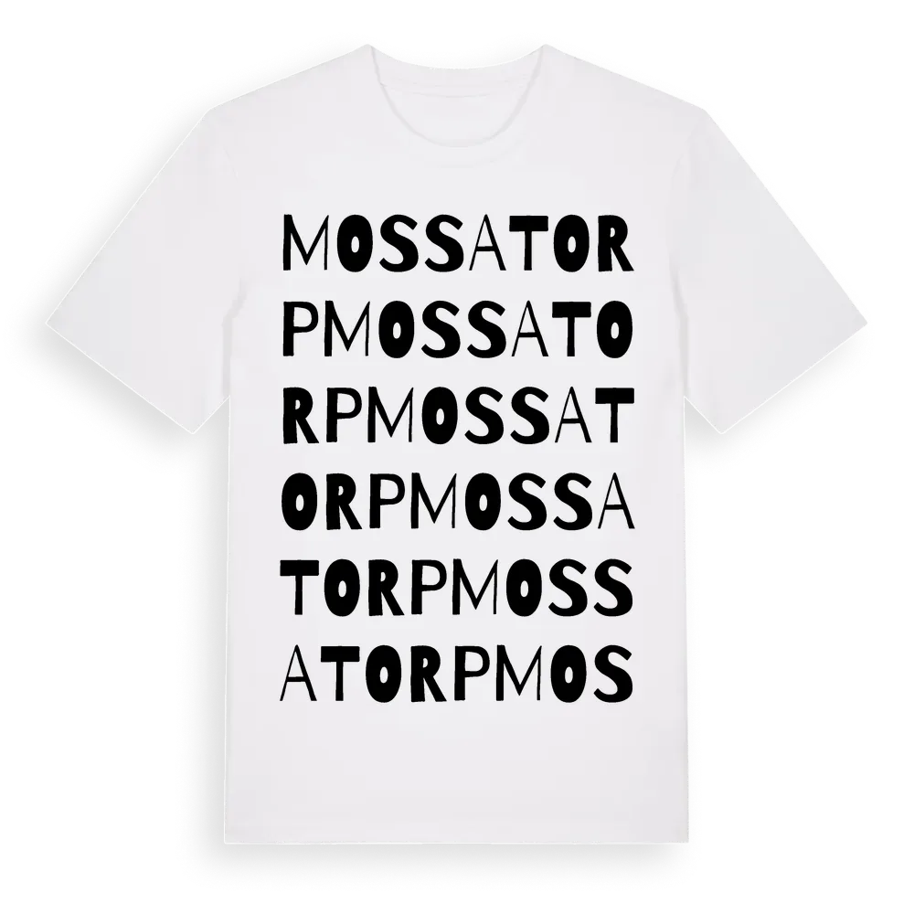 Mossatorp ordlek t-shirt är inspirerad av Mossatorp i Hallands län, Sverige. Tröjan är designad för dig som har en speciell koppling till platsen – oavsett om du bor här, har rötterna här eller bara älskar Mossatorp.