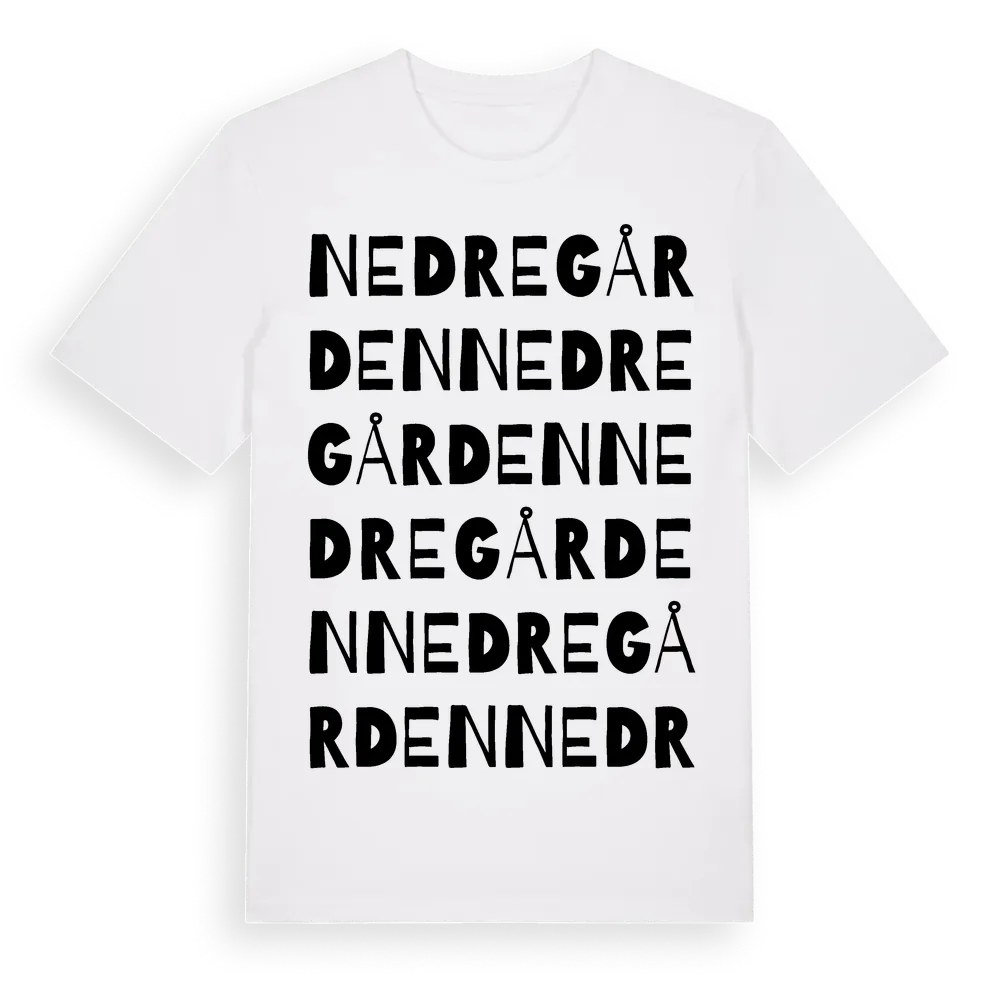 Nedregården ordlek t-shirt är inspirerad av Nedregården i Hallands län, Sverige. Tröjan är designad för dig som har en speciell koppling till platsen – oavsett om du bor här, har rötterna här eller bara älskar Nedregården.