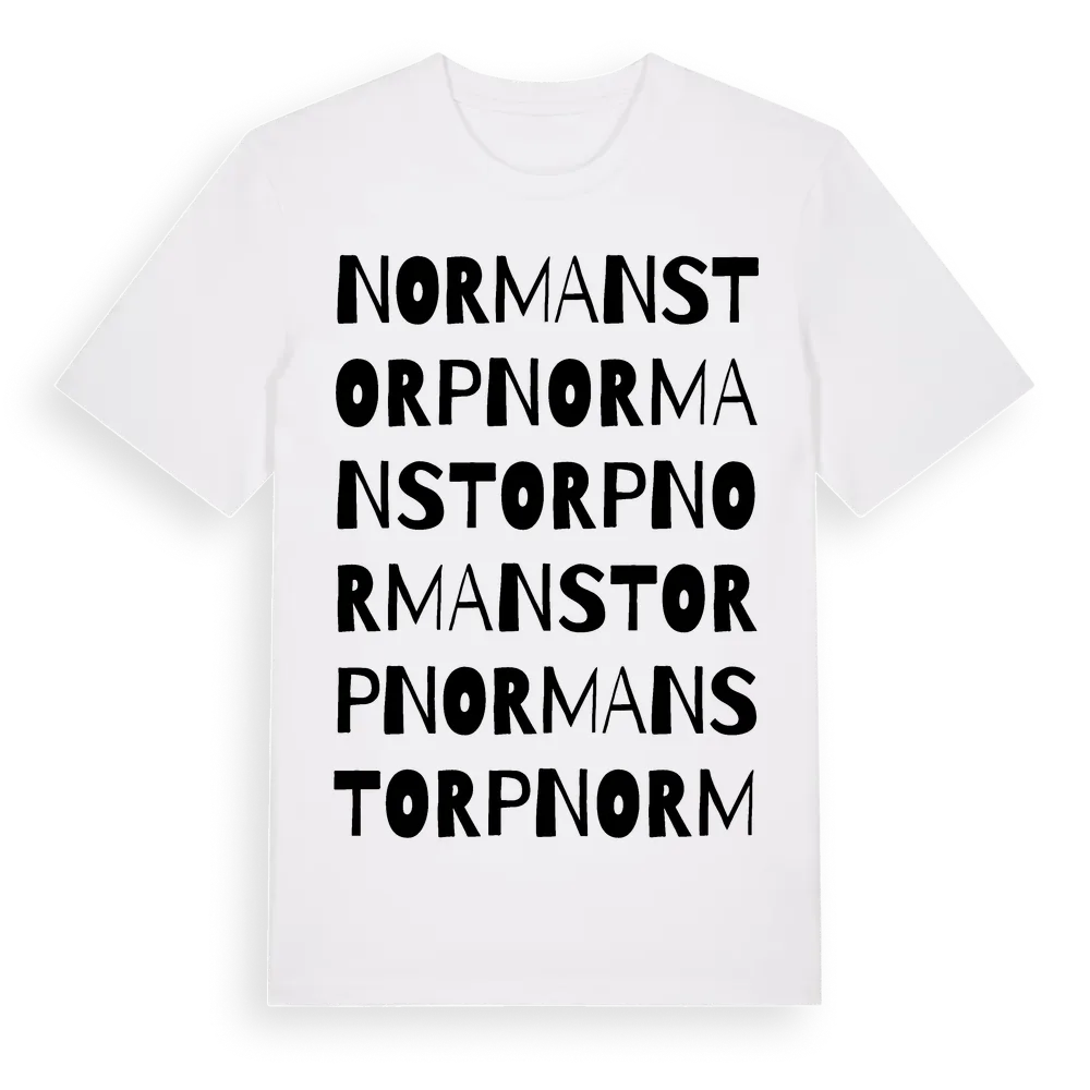 Normanstorp ordlek t-shirt är inspirerad av Normanstorp i Hallands län, Sverige. Tröjan är designad för dig som har en speciell koppling till platsen – oavsett om du bor här, har rötterna här eller bara älskar Normanstorp.