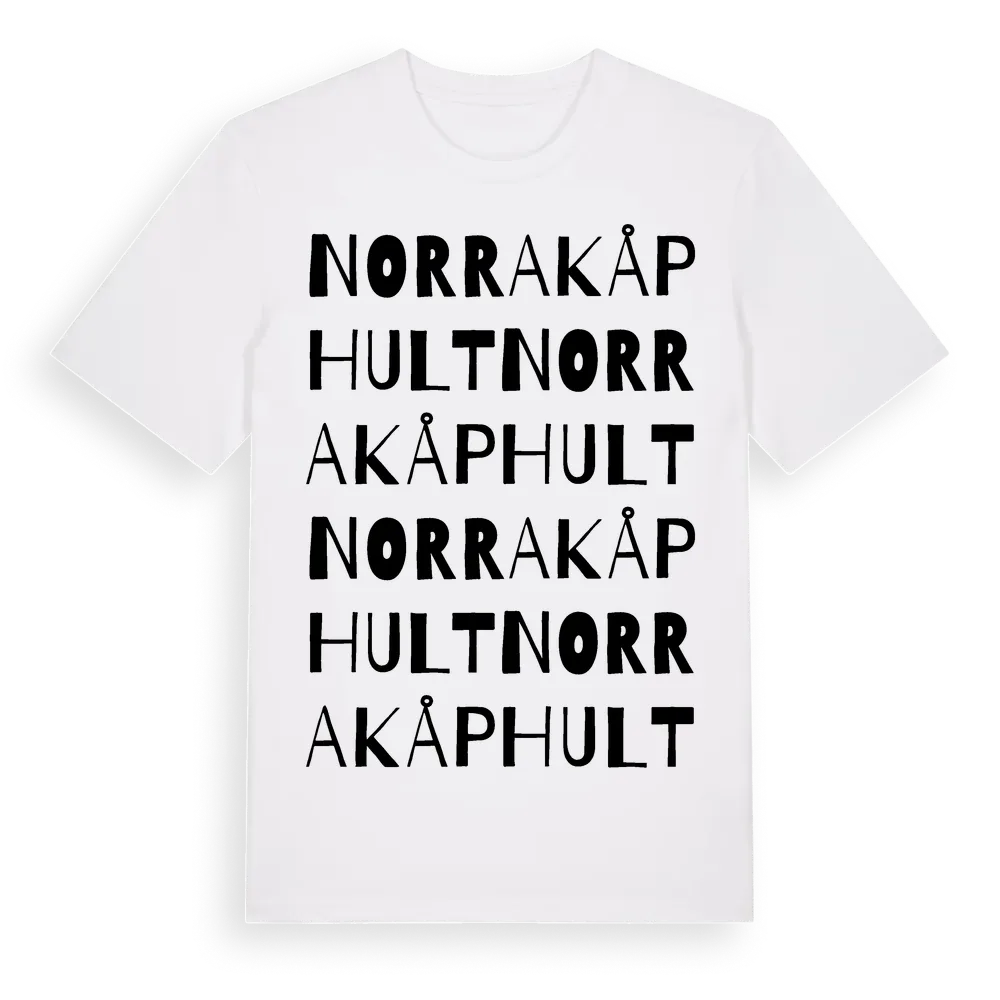 Norra Kåphult ordlek t-shirt är inspirerad av byn Norra Kåphult i Hallands län, Sverige. Tröjan är designad för dig som har en speciell koppling till platsen – oavsett om du bor här, har rötterna här eller bara älskar Norra Kåphult.