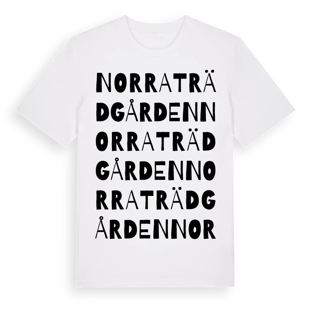 Norra Trädgården ordlek t-shirt är inspirerad av Norra Trädgården i Hallands län, Sverige. Tröjan är designad för dig som har en speciell koppling till platsen – oavsett om du bor här, har rötterna här eller bara älskar Norra Trädgården.