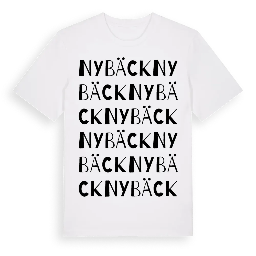 Nybäck ordlek t-shirt är inspirerad av Nybäck i Hallands län, Sverige. Tröjan är designad för dig som har en speciell koppling till platsen – oavsett om du bor här, har rötterna här eller bara älskar Nybäck.