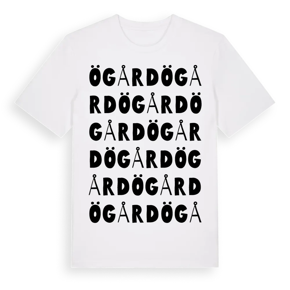 Ögård ordlek t-shirt är inspirerad av Ögård i Hallands län, Sverige. Tröjan är designad för dig som har en speciell koppling till platsen – oavsett om du bor här, har rötterna här eller bara älskar Ögård.