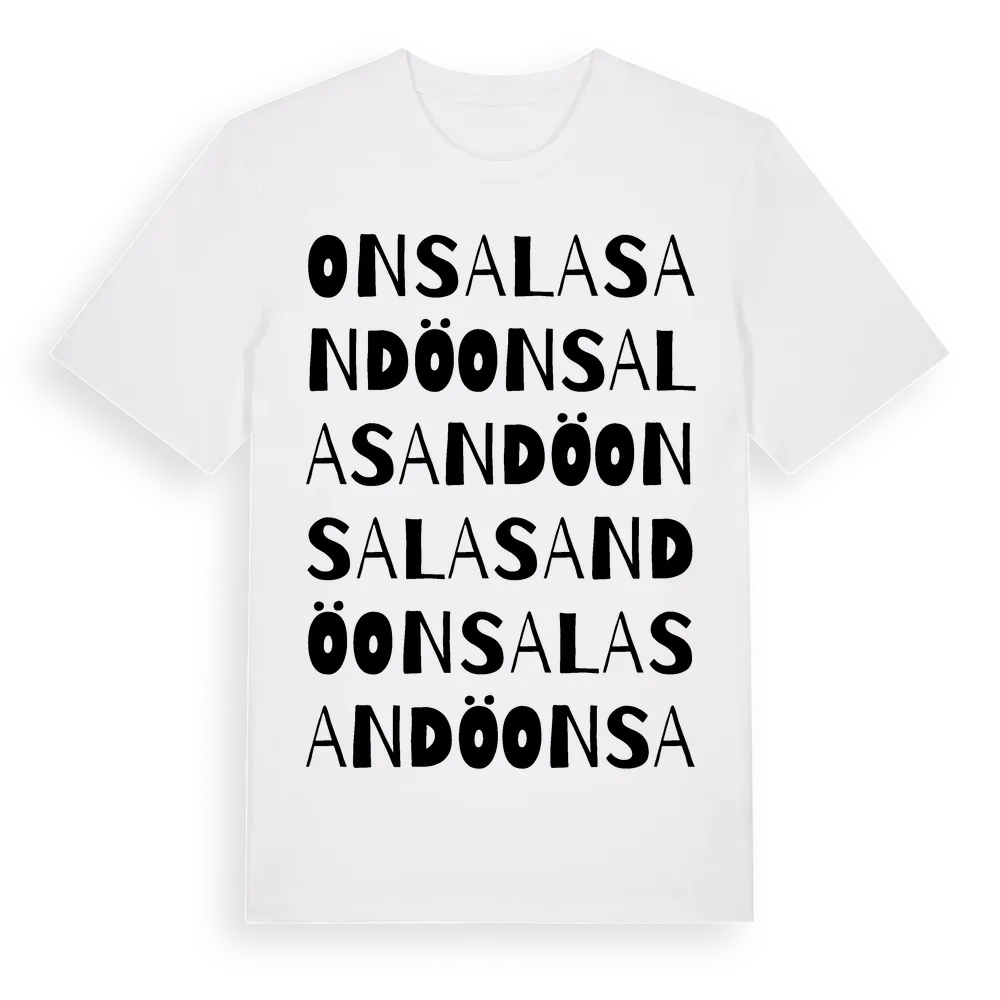 Onsala Sandö ordlek t-shirt är inspirerad av ön Onsala Sandö i Hallands län, Sverige. Tröjan är designad för dig som har en speciell koppling till platsen – oavsett om du bor här, har rötterna här eller bara älskar Onsala Sandö.
