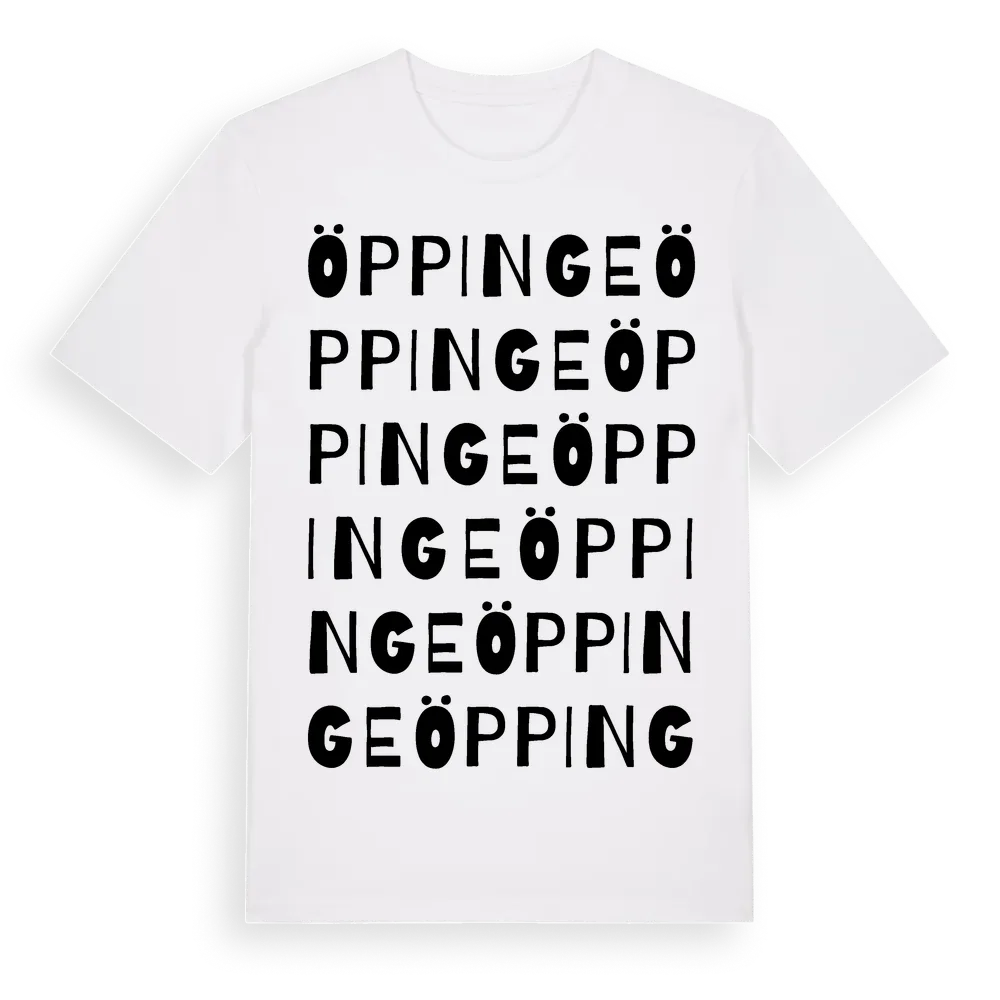 Öppinge ordlek t-shirt är inspirerad av byn Öppinge i Hallands län, Sverige. Tröjan är designad för dig som har en speciell koppling till platsen – oavsett om du bor här, har rötterna här eller bara älskar Öppinge.