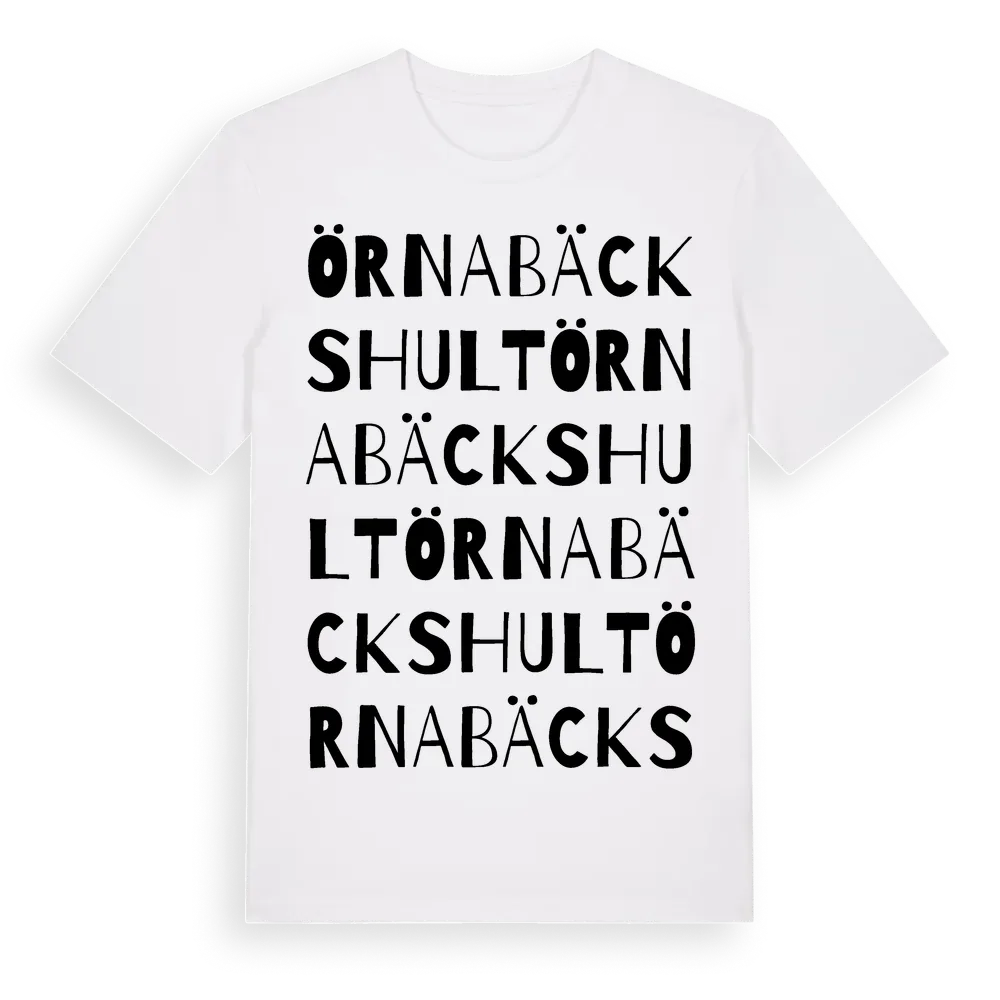 Örnabäckshult ordlek t-shirt är inspirerad av stadsdelen Örnabäckshult i Hallands län, Sverige. Tröjan är designad för dig som har en speciell koppling till platsen – oavsett om du bor här, har rötterna här eller bara älskar Örnabäckshult.