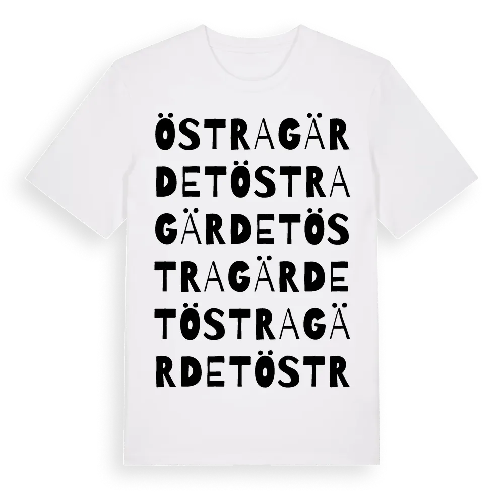 Östra Gärdet ordlek t-shirt är inspirerad av stadsdelen Östra Gärdet i Hallands län, Sverige. Tröjan är designad för dig som har en speciell koppling till platsen – oavsett om du bor här, har rötterna här eller bara älskar Östra Gärdet.