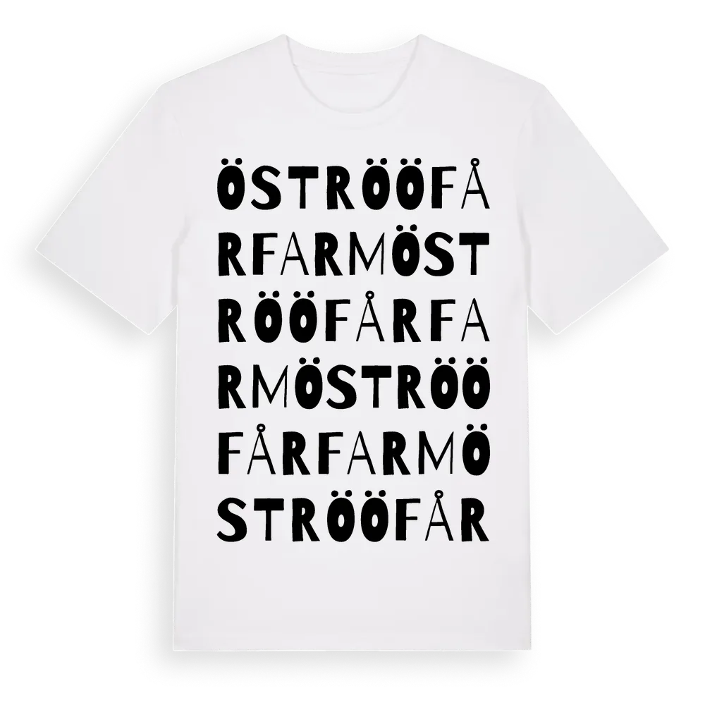 Öströö Fårfarm ordlek t-shirt är inspirerad av Öströö Fårfarm i Hallands län, Sverige. Tröjan är designad för dig som har en speciell koppling till platsen – oavsett om du bor här, har rötterna här eller bara älskar Öströö Fårfarm.