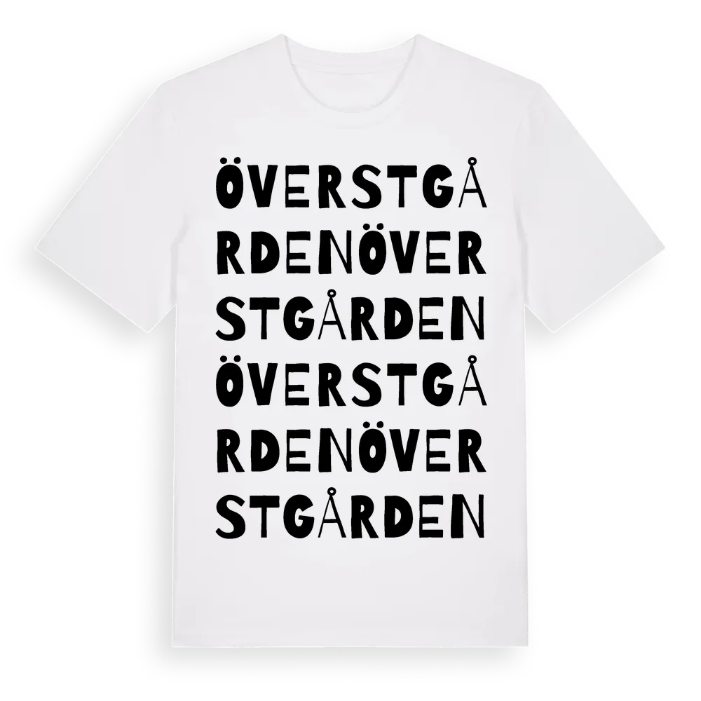 Överstgården ordlek t-shirt är inspirerad av Överstgården i Hallands län, Sverige. Tröjan är designad för dig som har en speciell koppling till platsen – oavsett om du bor här, har rötterna här eller bara älskar Överstgården.