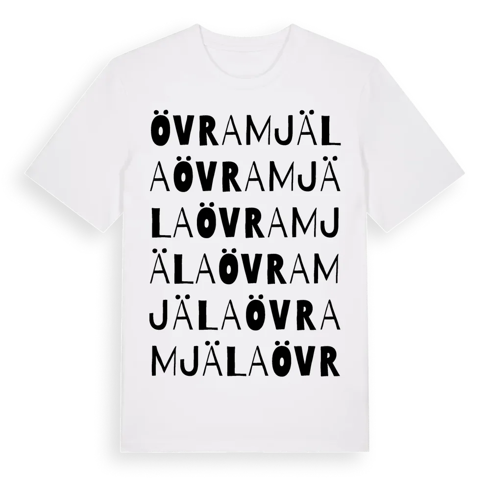 Övra Mjäla ordlek t-shirt är inspirerad av Övra Mjäla i Hallands län, Sverige. Tröjan är designad för dig som har en speciell koppling till platsen – oavsett om du bor här, har rötterna här eller bara älskar Övra Mjäla.
