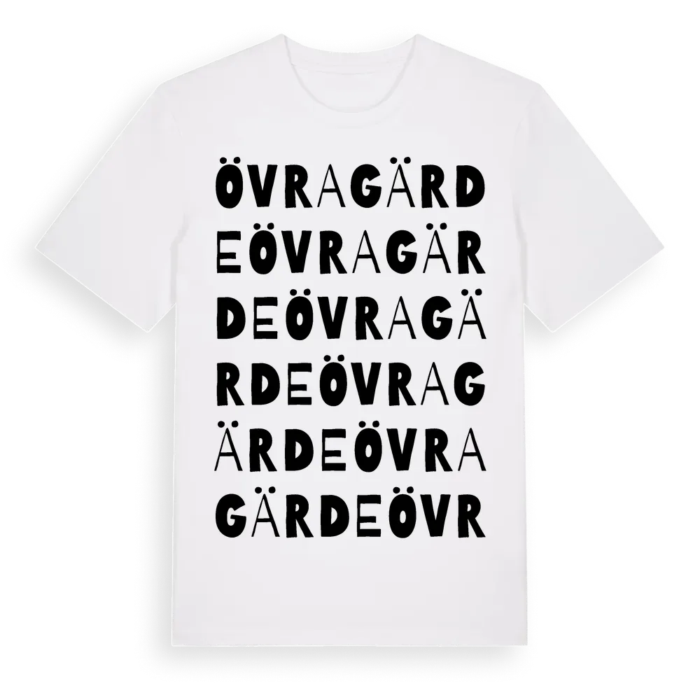 Övragärde ordlek t-shirt är inspirerad av Övragärde i Hallands län, Sverige. Tröjan är designad för dig som har en speciell koppling till platsen – oavsett om du bor här, har rötterna här eller bara älskar Övragärde.