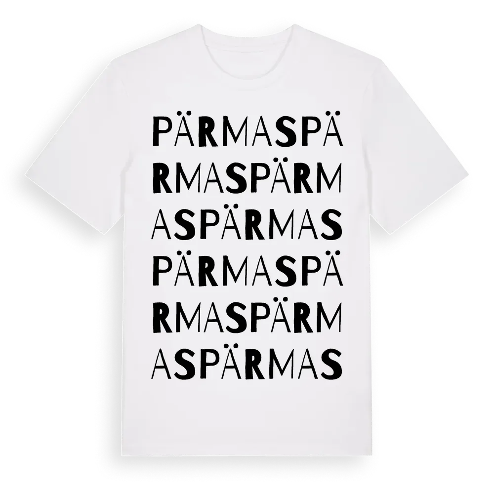 Pärmas ordlek t-shirt är inspirerad av Pärmas i Hallands län, Sverige. Tröjan är designad för dig som har en speciell koppling till platsen – oavsett om du bor här, har rötterna här eller bara älskar Pärmas.