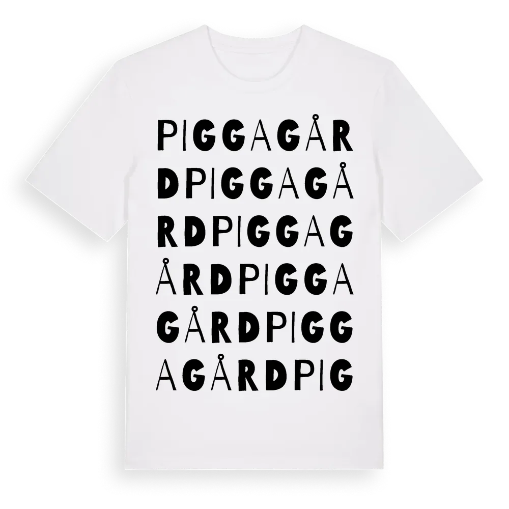 Piggagård ordlek t-shirt är inspirerad av Piggagård i Hallands län, Sverige. Tröjan är designad för dig som har en speciell koppling till platsen – oavsett om du bor här, har rötterna här eller bara älskar Piggagård.