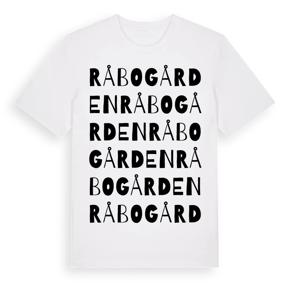 Råbogården ordlek t-shirt är inspirerad av Råbogården i Hallands län, Sverige. Tröjan är designad för dig som har en speciell koppling till platsen – oavsett om du bor här, har rötterna här eller bara älskar Råbogården.
