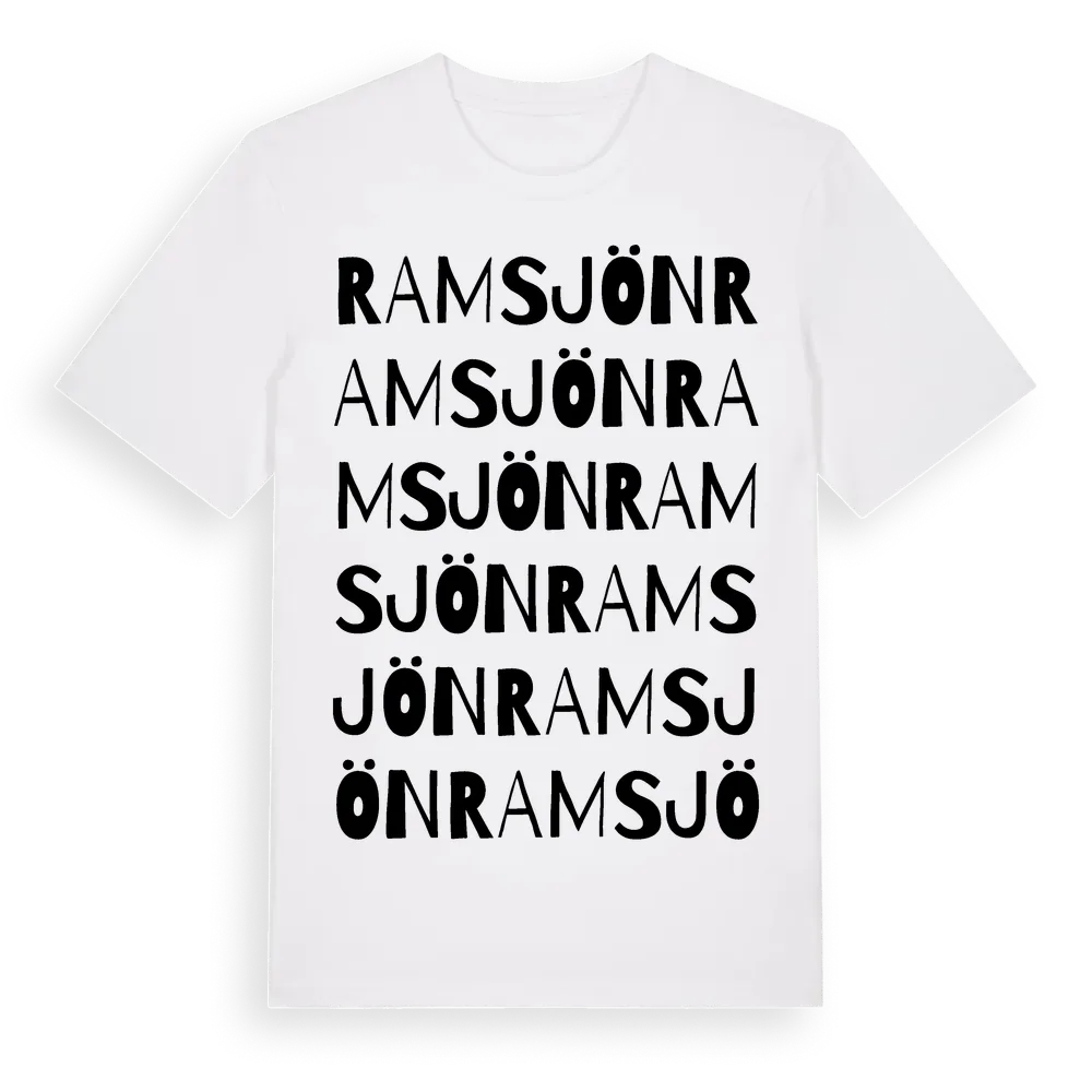 Ramsjön ordlek t-shirt är inspirerad av byn Ramsjön i Hallands län, Sverige. Tröjan är designad för dig som har en speciell koppling till platsen – oavsett om du bor här, har rötterna här eller bara älskar Ramsjön.
