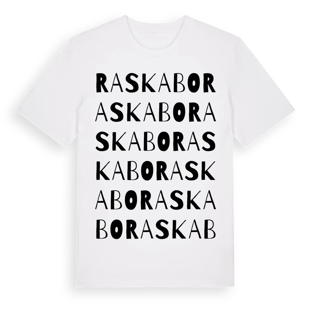 Raskabo ordlek t-shirt är inspirerad av Raskabo i Hallands län, Sverige. Tröjan är designad för dig som har en speciell koppling till platsen – oavsett om du bor här, har rötterna här eller bara älskar Raskabo.