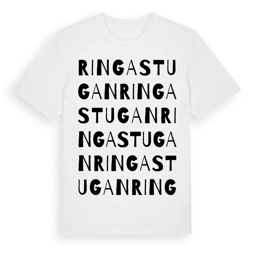 Ringastugan ordlek t-shirt är inspirerad av Ringastugan i Hallands län, Sverige. Tröjan är designad för dig som har en speciell koppling till platsen – oavsett om du bor här, har rötterna här eller bara älskar Ringastugan.