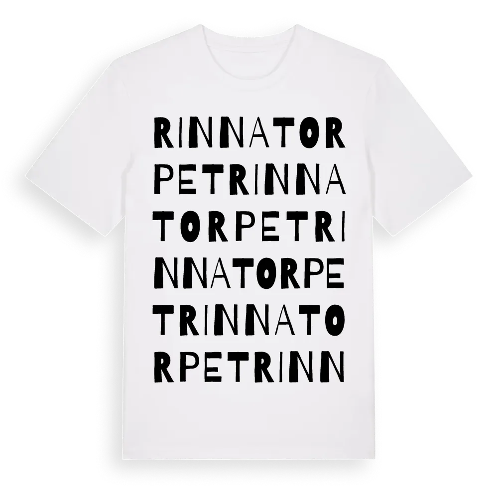 Rinnatorpet ordlek t-shirt är inspirerad av Rinnatorpet i Hallands län, Sverige. Tröjan är designad för dig som har en speciell koppling till platsen – oavsett om du bor här, har rötterna här eller bara älskar Rinnatorpet.