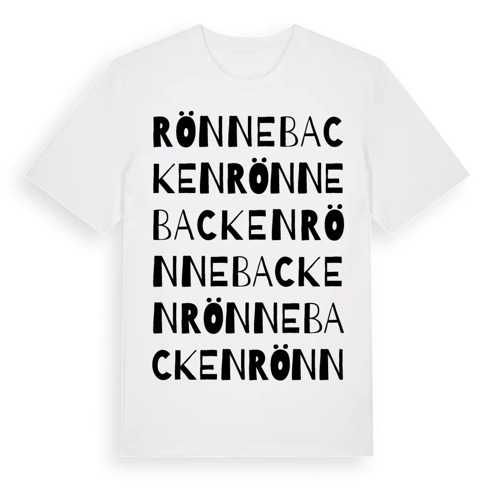 Rönnebacken ordlek t-shirt är inspirerad av Rönnebacken i Hallands län, Sverige. Tröjan är designad för dig som har en speciell koppling till platsen – oavsett om du bor här, har rötterna här eller bara älskar Rönnebacken.