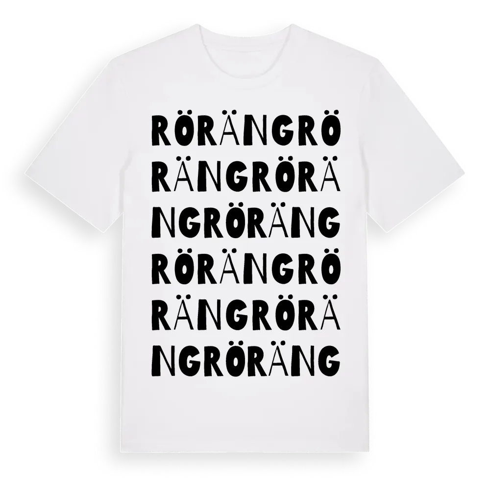 Röräng ordlek t-shirt är inspirerad av Röräng i Hallands län, Sverige. Tröjan är designad för dig som har en speciell koppling till platsen – oavsett om du bor här, har rötterna här eller bara älskar Röräng.
