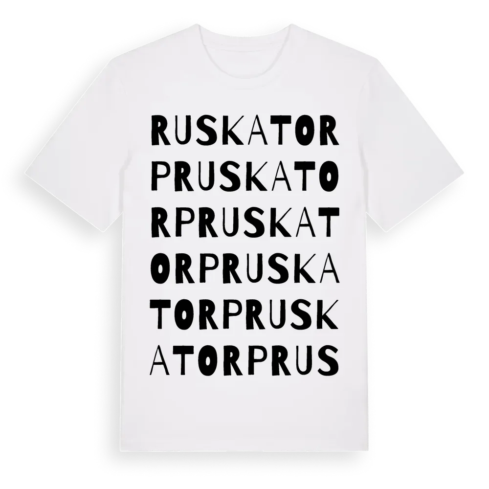 Ruskatorp ordlek t-shirt är inspirerad av Ruskatorp i Hallands län, Sverige. Tröjan är designad för dig som har en speciell koppling till platsen – oavsett om du bor här, har rötterna här eller bara älskar Ruskatorp.