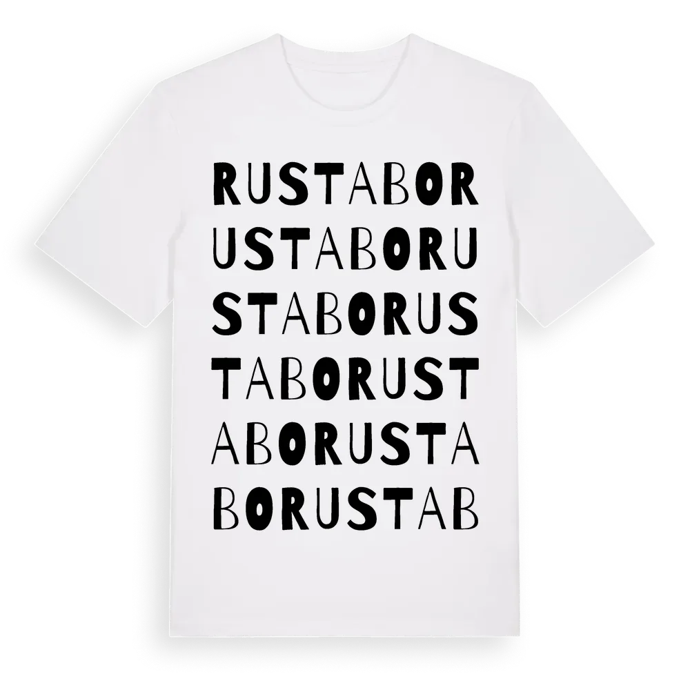 Rustabo ordlek t-shirt är inspirerad av Rustabo i Hallands län, Sverige. Tröjan är designad för dig som har en speciell koppling till platsen – oavsett om du bor här, har rötterna här eller bara älskar Rustabo.