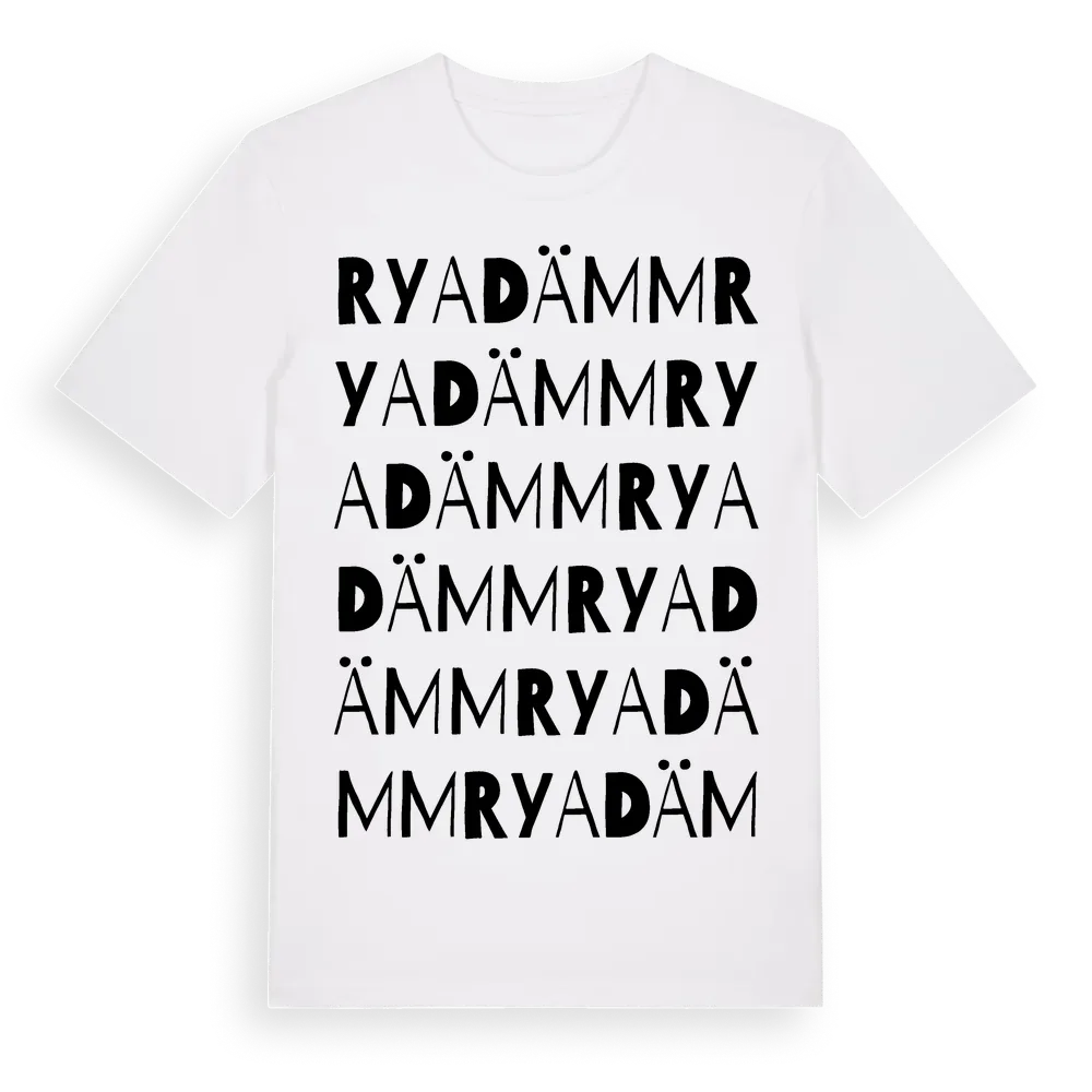 Ryadämm ordlek t-shirt är inspirerad av Ryadämm i Hallands län, Sverige. Tröjan är designad för dig som har en speciell koppling till platsen – oavsett om du bor här, har rötterna här eller bara älskar Ryadämm.