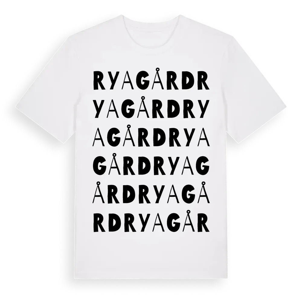 Ryagård ordlek t-shirt är inspirerad av Ryagård i Hallands län, Sverige. Tröjan är designad för dig som har en speciell koppling till platsen – oavsett om du bor här, har rötterna här eller bara älskar Ryagård.