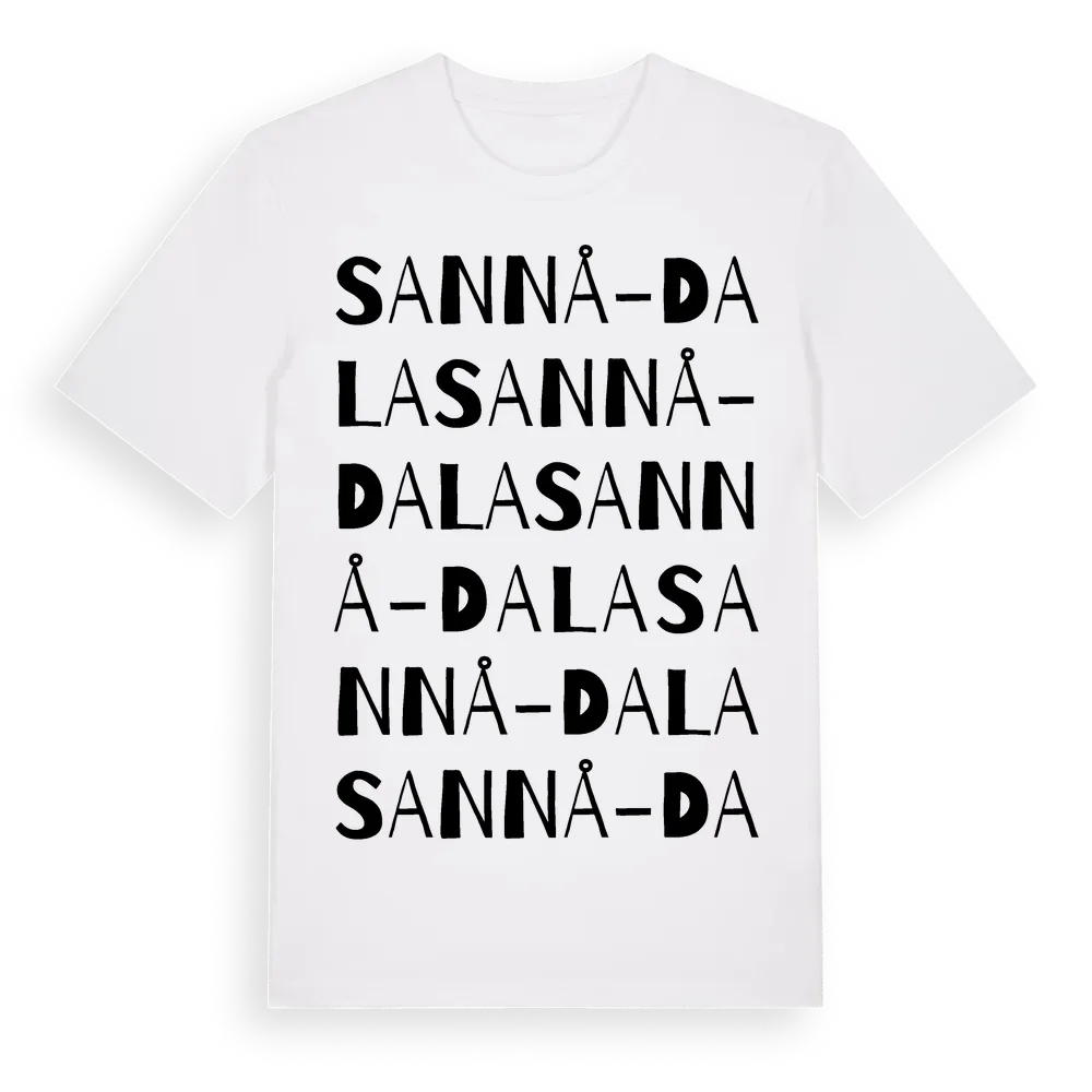 Sannå-Dala ordlek t-shirt är inspirerad av byn Sannå-Dala i Hallands län, Sverige. Tröjan är designad för dig som har en speciell koppling till platsen – oavsett om du bor här, har rötterna här eller bara älskar Sannå-Dala.
