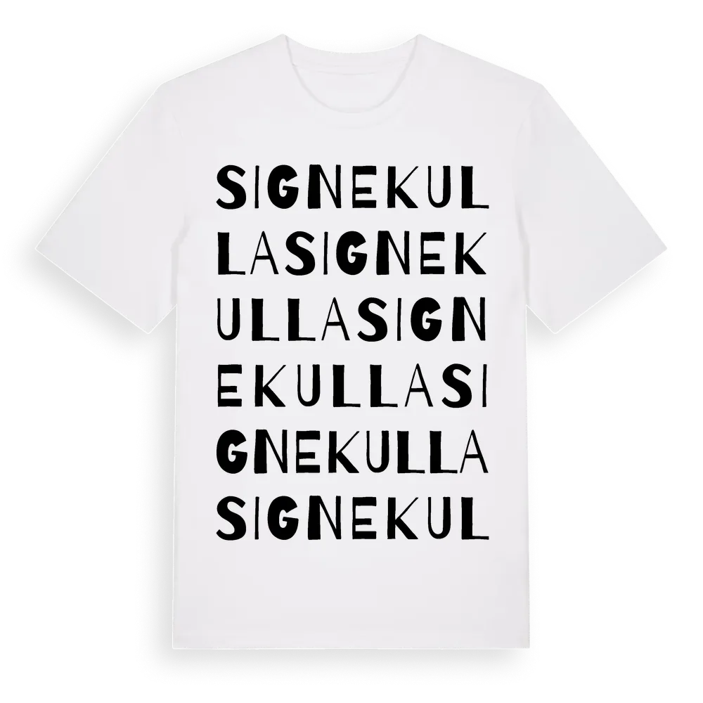 Signekulla ordlek t-shirt är inspirerad av Signekulla i Hallands län, Sverige. Tröjan är designad för dig som har en speciell koppling till platsen – oavsett om du bor här, har rötterna här eller bara älskar Signekulla.
