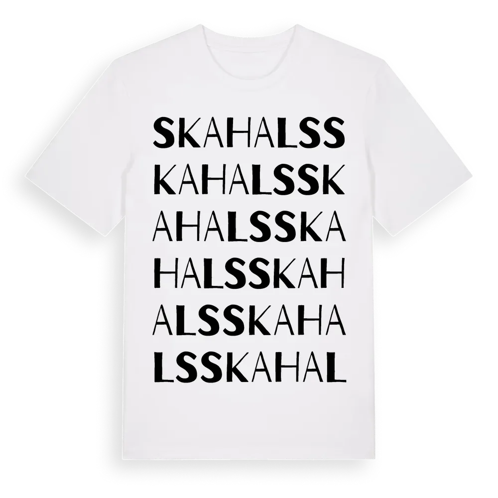 Skahals ordlek t-shirt är inspirerad av Skahals i Hallands län, Sverige. Tröjan är designad för dig som har en speciell koppling till platsen – oavsett om du bor här, har rötterna här eller bara älskar Skahals.