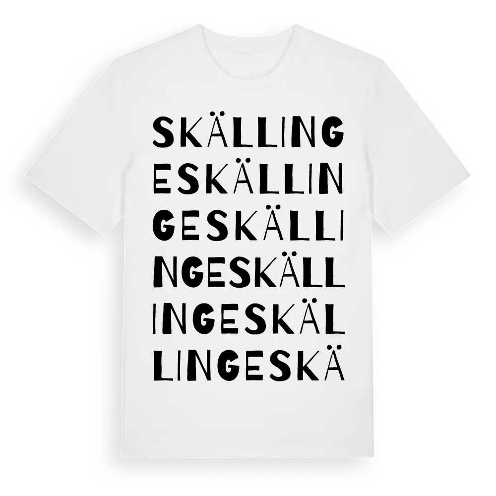 Skällinge ordlek t-shirt är inspirerad av byn Skällinge i Hallands län, Sverige. Tröjan är designad för dig som har en speciell koppling till platsen – oavsett om du bor här, har rötterna här eller bara älskar Skällinge.