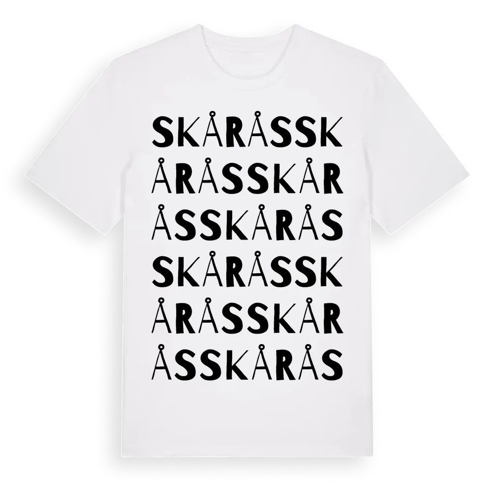 Skårås ordlek t-shirt är inspirerad av Skårås i Hallands län, Sverige. Tröjan är designad för dig som har en speciell koppling till platsen – oavsett om du bor här, har rötterna här eller bara älskar Skårås.