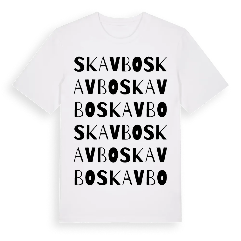 Skavbo ordlek t-shirt är inspirerad av byn Skavbo i Hallands län, Sverige. Tröjan är designad för dig som har en speciell koppling till platsen – oavsett om du bor här, har rötterna här eller bara älskar Skavbo.