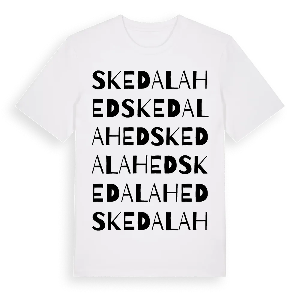 Skedalahed ordlek t-shirt är inspirerad av Skedalahed i Hallands län, Sverige. Tröjan är designad för dig som har en speciell koppling till platsen – oavsett om du bor här, har rötterna här eller bara älskar Skedalahed.