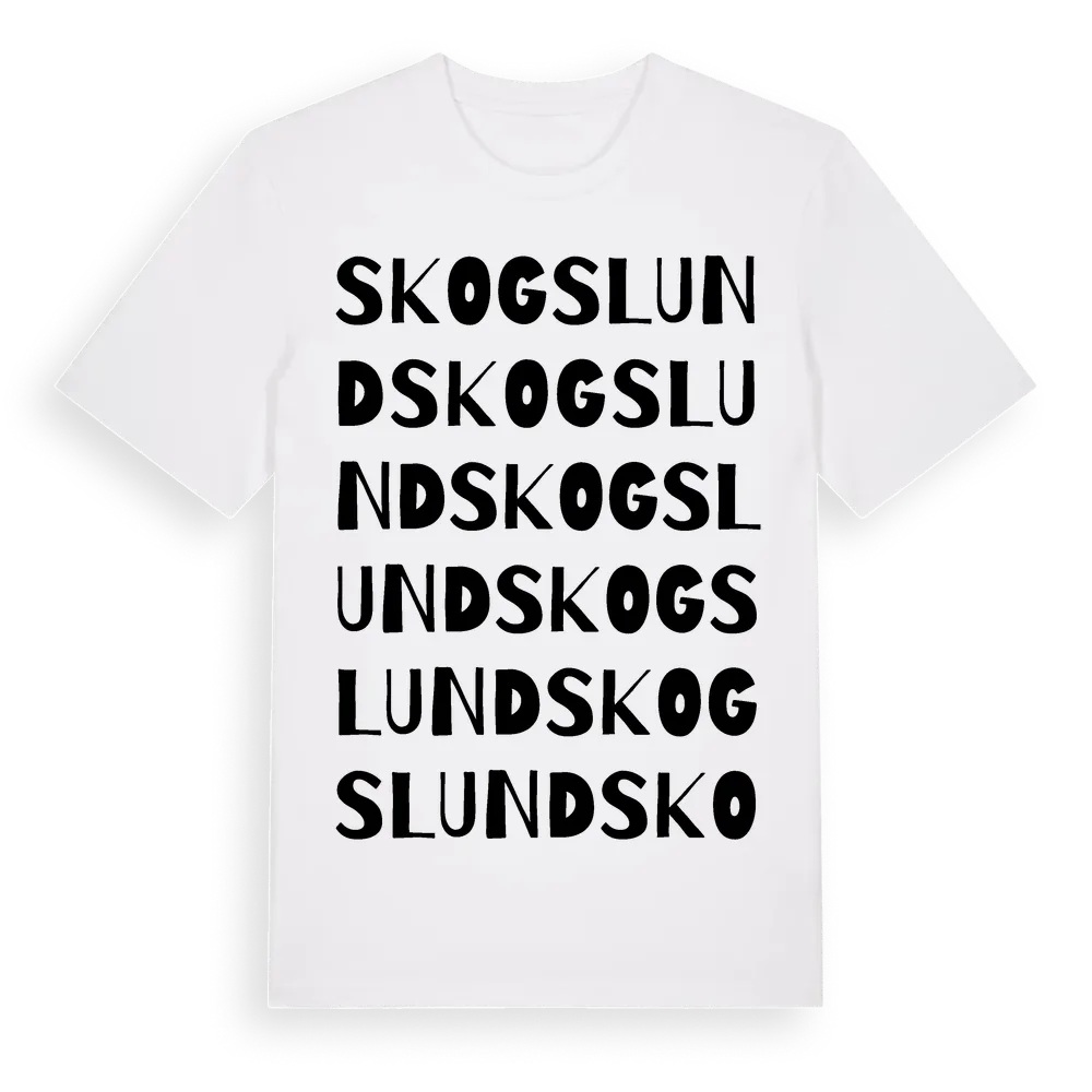 Skogslund ordlek t-shirt är inspirerad av Skogslund i Hallands län, Sverige. Tröjan är designad för dig som har en speciell koppling till platsen – oavsett om du bor här, har rötterna här eller bara älskar Skogslund.