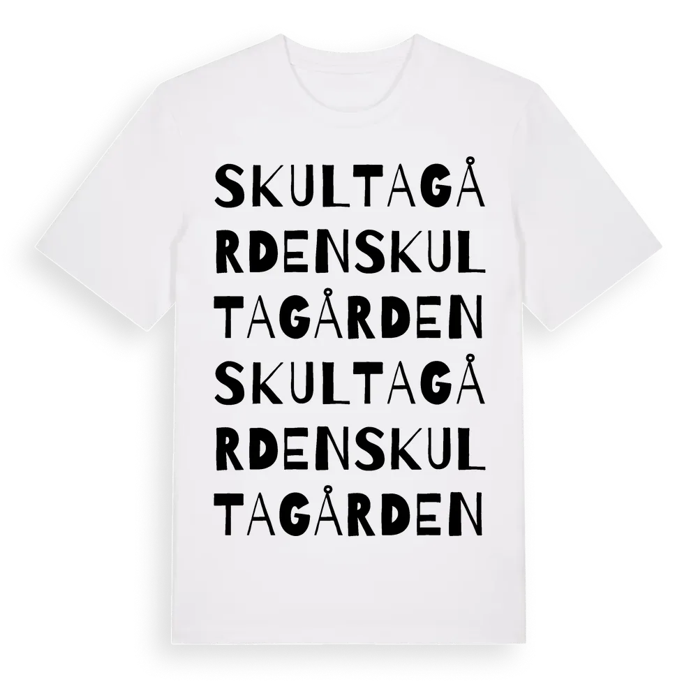 Skultagården ordlek t-shirt är inspirerad av Skultagården i Hallands län, Sverige. Tröjan är designad för dig som har en speciell koppling till platsen – oavsett om du bor här, har rötterna här eller bara älskar Skultagården.