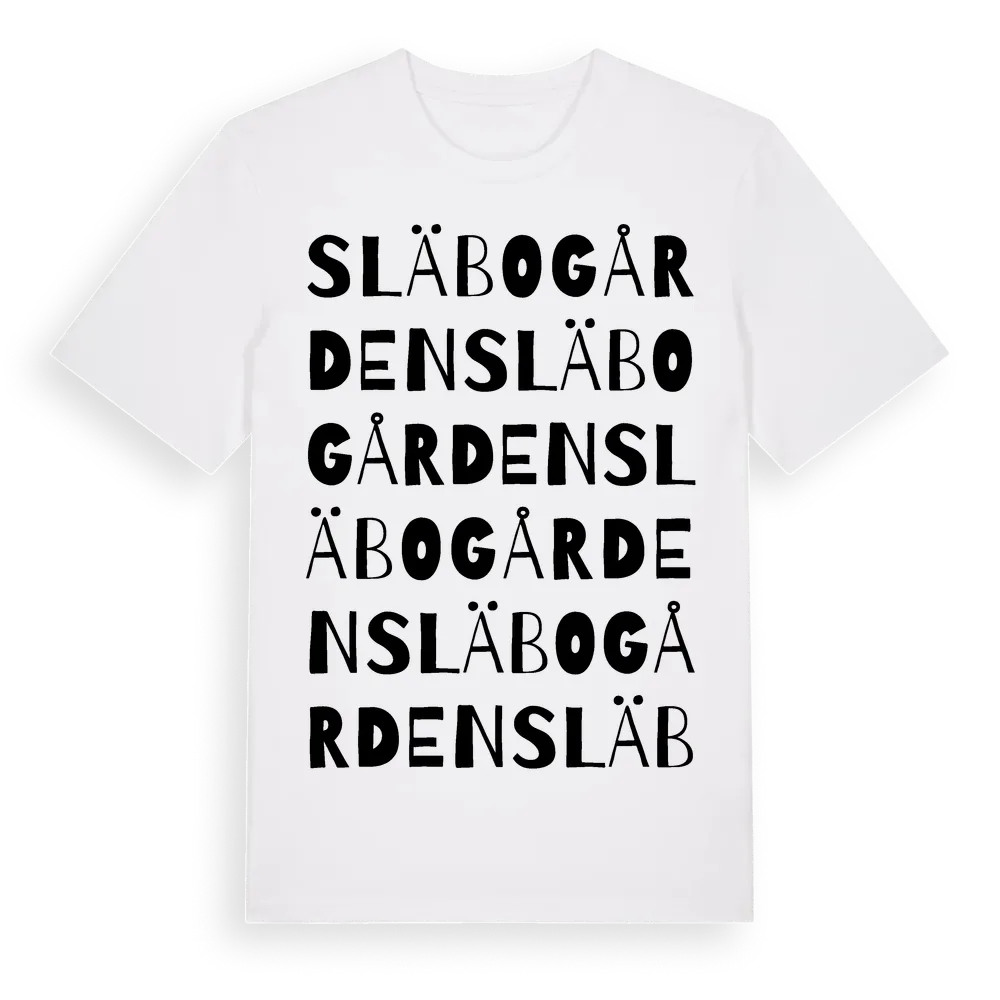 Släbogården ordlek t-shirt är inspirerad av Släbogården i Hallands län, Sverige. Tröjan är designad för dig som har en speciell koppling till platsen – oavsett om du bor här, har rötterna här eller bara älskar Släbogården.