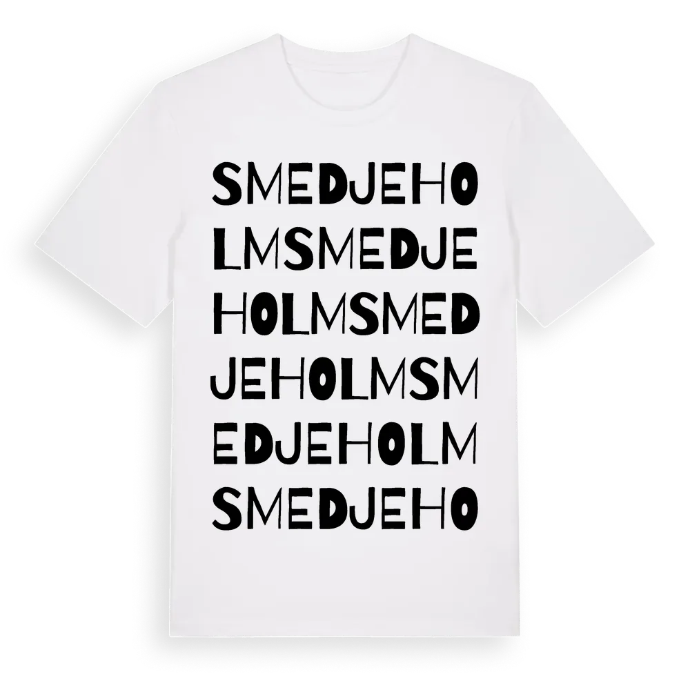 Smedjeholm ordlek t-shirt är inspirerad av Smedjeholm i Hallands län, Sverige. Tröjan är designad för dig som har en speciell koppling till platsen – oavsett om du bor här, har rötterna här eller bara älskar Smedjeholm.