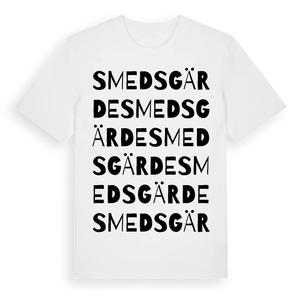 Smedsgärde ordlek t-shirt är inspirerad av Smedsgärde i Hallands län, Sverige. Tröjan är designad för dig som har en speciell koppling till platsen – oavsett om du bor här, har rötterna här eller bara älskar Smedsgärde.